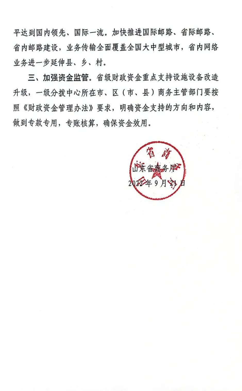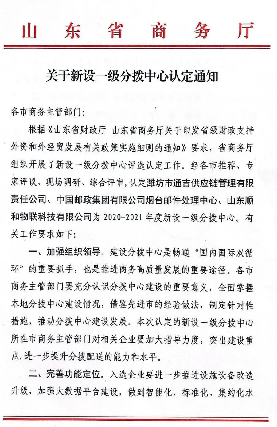 熱烈慶祝山東順和物聯科技有限公司被山東省商務廳評選為“2020-2021年度新設一級分撥中心”。