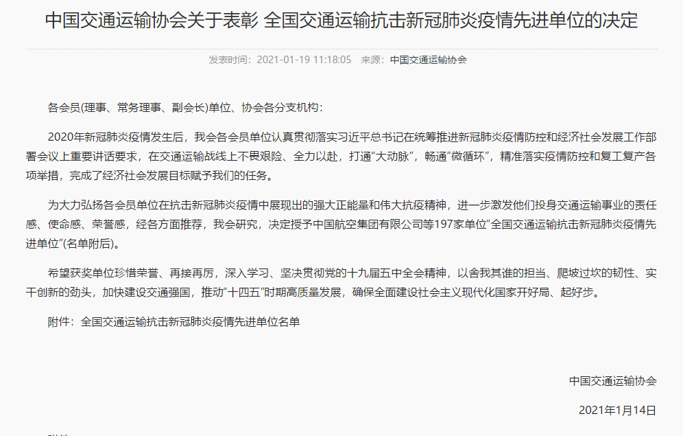 中國(guó)交通運(yùn)輸協(xié)會(huì)關(guān)于表彰 全國(guó)交通運(yùn)輸抗擊新冠肺炎疫情先進(jìn)單位的決定